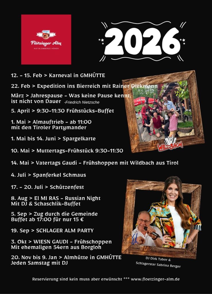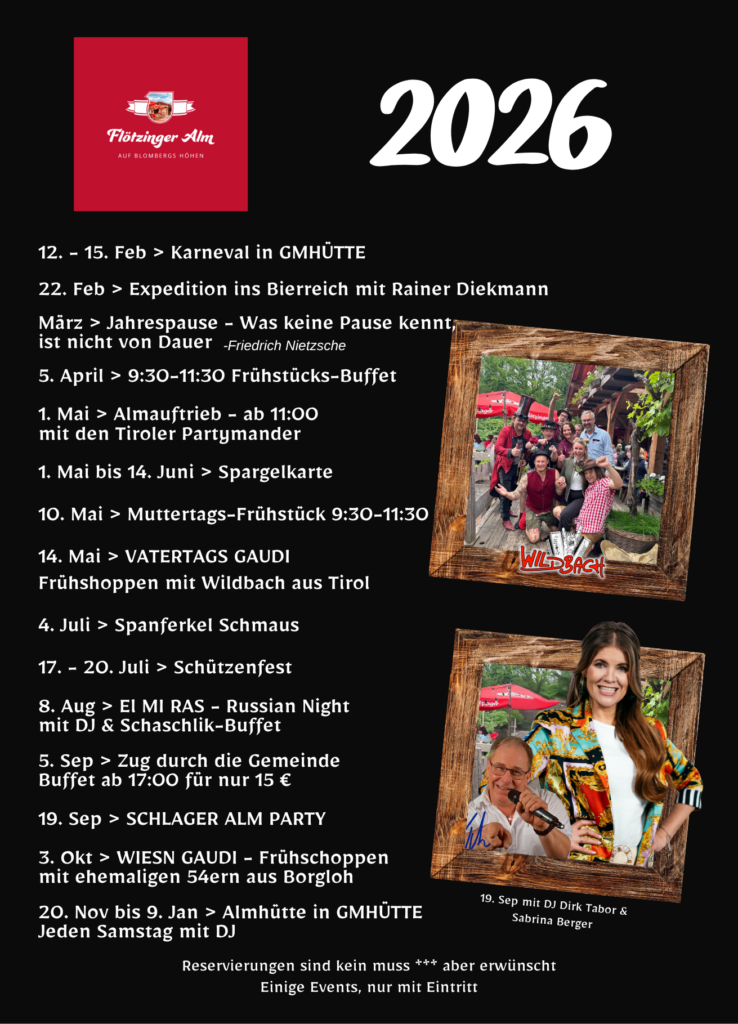 Ab sofort heißt es: Alm-Hütte und Alm-Wirtshaus an einem Standort in Bad Laer bei Osnabrück! Hier bei uns auf der Flötzinger Alm ist immer etwas los! Mal könnt ihr ganz entspannt im Tagesgeschäft bei uns eure Zeit genießen, das andere mal zu bayrischer Volksmusik das Tanzbein schwingen, oder es sorgt ein DJ für beste Stimmung wie am 1. Mai oder unsere beliebte Schlager ALM Party. Egal, ob ihr feiern, tanzen oder einfach nur einen gemütlichen Abend mit Freunden verbringen wollt – bei uns seid ihr genau richtig.
